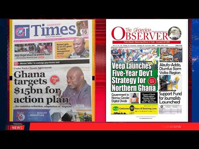 NewsGhana Newspaper [04/11/22] GHANA NEWSPAPER HEADLINES: Ghana Targets $15bn For Action Plan; more 4th November 2022 0 353 Share Facebook Twitter WhatsApp Linkedin Pinterest Telegram Viber Today’s Newspaper Headlines Duffuor Declares NDC Flagbearer Bid Ghana Targets $15bn For Action Plan Veep Launches Five-year Dev’t Strategy For Northern Ghana Indexing Salaries To Dollar Untamable more…