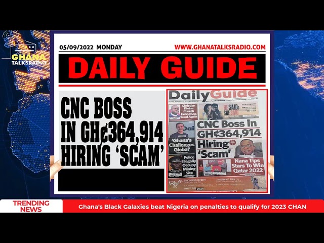 NewsGhana Newspaper [05/09/22] GHANA NEWSPAPER HEADLINES: Akufo-Addo Touts Gains in Corruption Fight and more… 5th September 2022 0 377 Share Facebook Twitter WhatsApp Linkedin Pinterest Telegram Viber Today’s News Paper Headlines DCE BONZO BNI Capo Arrested Komenda Sugar Factory Revamped Telcos Directed to Block Defaulters Akufo-Addo Touts Gains in Corruption Fight CNC Boss in GHc 364,914 Hiring ‘Scam’ Free-SHS Quality Intact