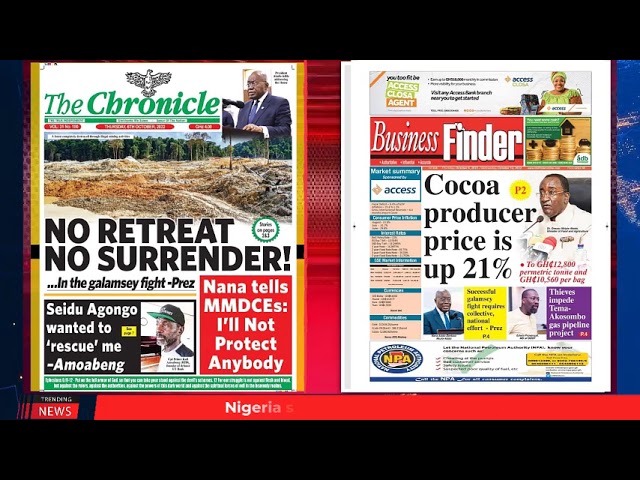 NewsGhana Newspaper [06/10/22] GHANA NEWSPAPER HEADLINES: Akufo-Addo summons ‘galamsey’ DCE; more 6th October 2022 0 357 Share Facebook Twitter WhatsApp Linkedin Pinterest Telegram Viber Today’s Newspaper Headlines Akufo-Addo summons ‘galamsey’ DCE No retreat no surrender Cocoa producer price is up 21% Fighting galamsey cost me & NPP many votes in 2020 – Akufo-Addo confesses