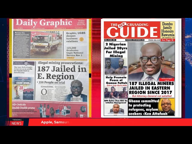 NewsGhana Newspaper [13/10/22] GHANA NEWSPAPER HEADLINES: 187 Illegal Miners Jailed In Eastern Region Since 2017; more 13th October 2022 0 359 Share Facebook Twitter WhatsApp Linkedin Pinterest Telegram Viber Today’s Newspaper Headlines ‘Aisha Huang Not My Client’ 187 Illegal Miners Jailed In Eastern Region Since 2017 Ghana Police Service Sued Vicious Attack To Scuttle Galamsey Fight Out Bawumia Will Win Npp Flag Bearer Elections – Ben Ephson
