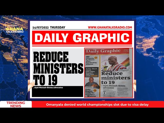 NewsGhana Newspaper [14/07/22] GTR NEWSPAPER HEADLINES: Who Leads NPP Youth?, Reduce Ministers to 19, more 14th July 2022 0 498 Share Facebook Twitter WhatsApp Linkedin Pinterest Telegram Viber Top headlines from today’s papers…