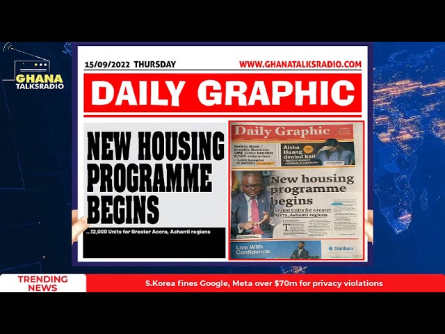 NewsGhana Newspaper [15/09/22] GHANA NEWSPAPER HEADLINES: New housing programme begins; Black Star Square left to decay?; more 15th September 2022 0 367 Share Facebook Twitter WhatsApp Linkedin Pinterest Telegram Viber Today’s News Paper Headlines
