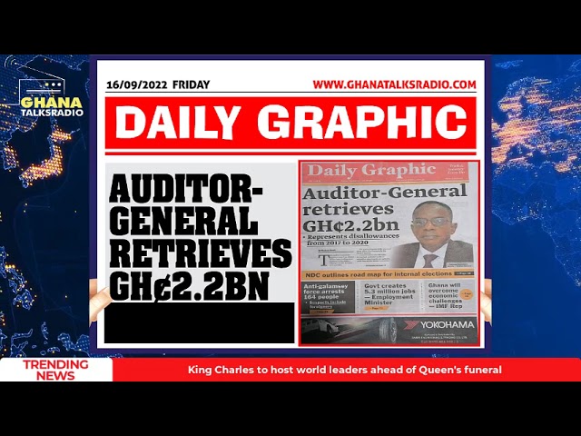 NewsGhana Newspaper [16/09/22] GHANA NEWSPAPER HEADLINES: Auditor General retrieves ¢2.2bn; Aisha Huang married to Ghanaian; more 16th September 2022 0 723 Share Facebook Twitter WhatsApp Linkedin Pinterest Telegram Viber Today’s News Paper Headlines