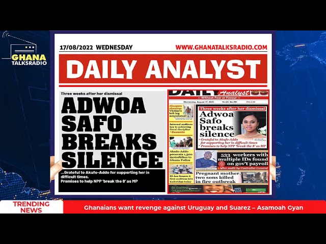 NewsGhana Newspaper [17/08/22] GTR NEWSPAPER HEADLINES: 148,000 Employees Missing, Adwoa Safo Breaks Silence; more 17th August 2022 0 343 Share Facebook Twitter WhatsApp Linkedin Pinterest Telegram Viber Top headlines from today’s papers… 148,000 Employees Missing, Adwoa Safo Breaks Silence; more