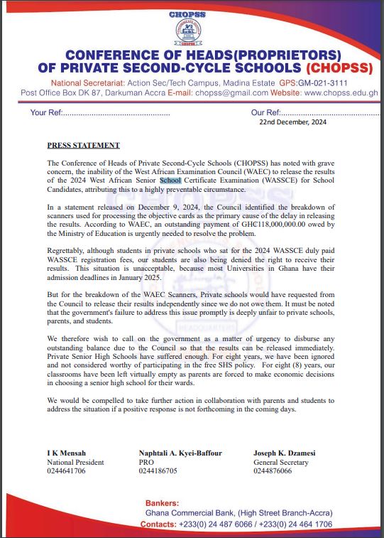 The Conference of Heads of Private Second-Cycle Schools (CHOPSS) has raised grave concerns over the delay in releasing the 2024 West African Senior School Certificate Examination (WASSCE) results for school candidates, calling the situation avoidable.
