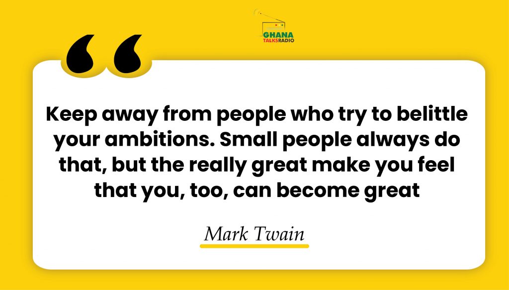 “Keep away from people who try to belittle your ambitions. Small people always do that, but the really great make you feel that you, too, can become great.” ~Mark Twain