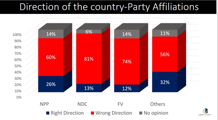 The poll also revealed that 60% of New Patriotic Party (NPP) affiliates disapprove of the path the country is headed while 81% of affiliates of the National Democratic Congress (NDC) also say the party is on the wrong path.