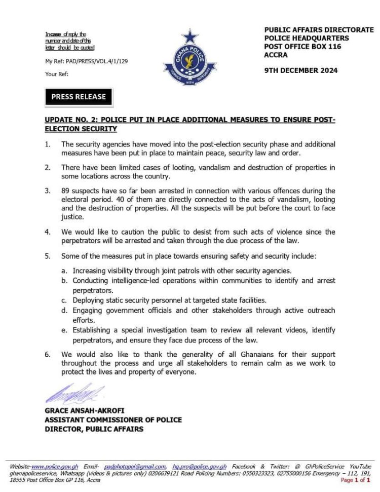 The Ghana Police Service has announced the arrest of 89 individuals in connection with various offenses committed during the 2024 general elections.