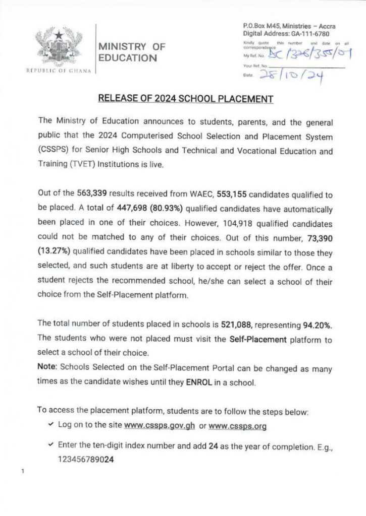 As of Monday, October 28, GES reported that out of 563,339 results received from WAEC, 553,155 students qualified for school placement, with 447,698 students (80.93%) being automatically placed in one of their selected schools.