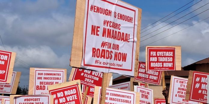 Scores of residents from Gyetiase and Tadiaso, communities within the Sekyere Central District of the Ashanti Region, have taken to the streets to protest against poor road infrastructure, accusing successive governments of neglect.