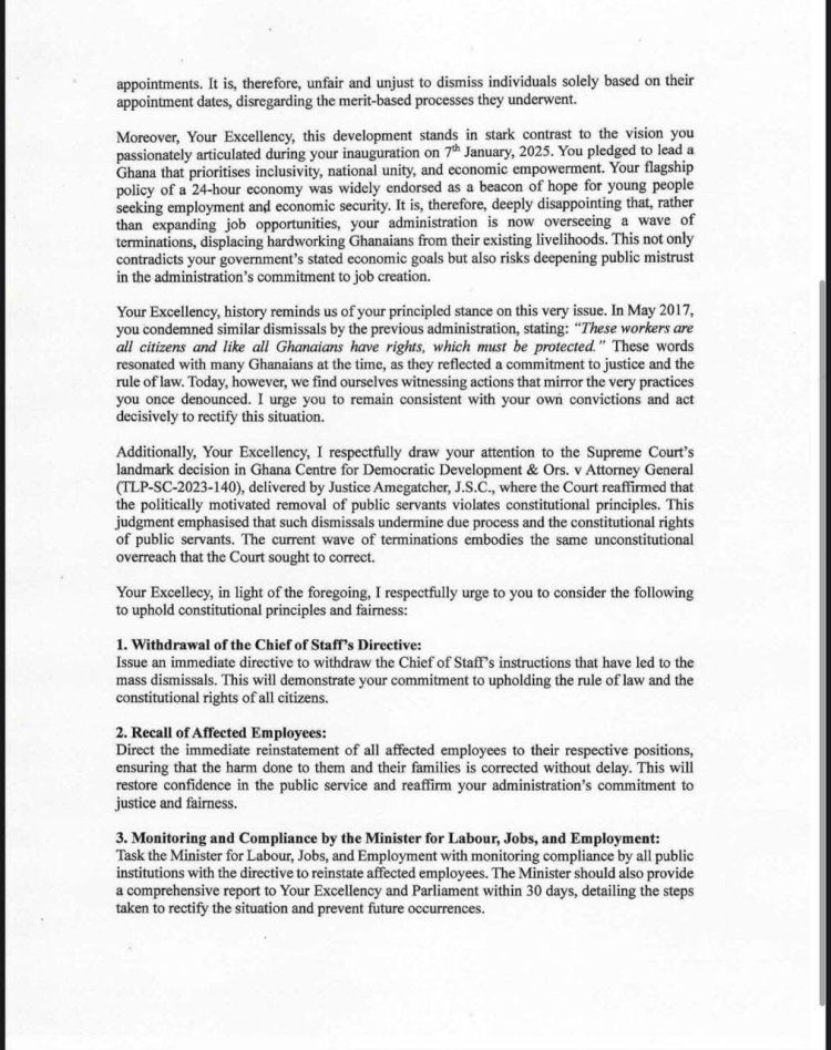 “They will serve as a testament to your leadership and your unwavering dedication to the welfare of all Ghanaians. Your Excellency, while affected individuals may seek legal recourse through Articles 2(1) and 130 of the Constitution, I firmly believe that your prompt intervention can pre-empt the need for protracted litigation.