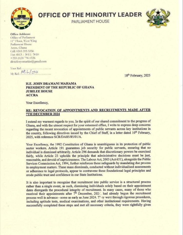 Minority Leader Alexander Afenyo-Markin has called on President John Dramani Mahama to immediately withdraw the Chief of Staff’s directive that led to mass dismissals.