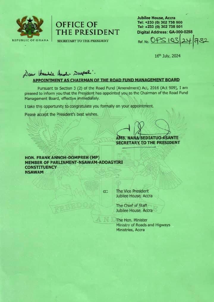This appointment was confirmed in a letter signed by Ambassador Nana Asante Bediatuo, Secretary to the President, citing section 3(2) of the Road Fund (Amendment) Act, 2016 (Act 909).