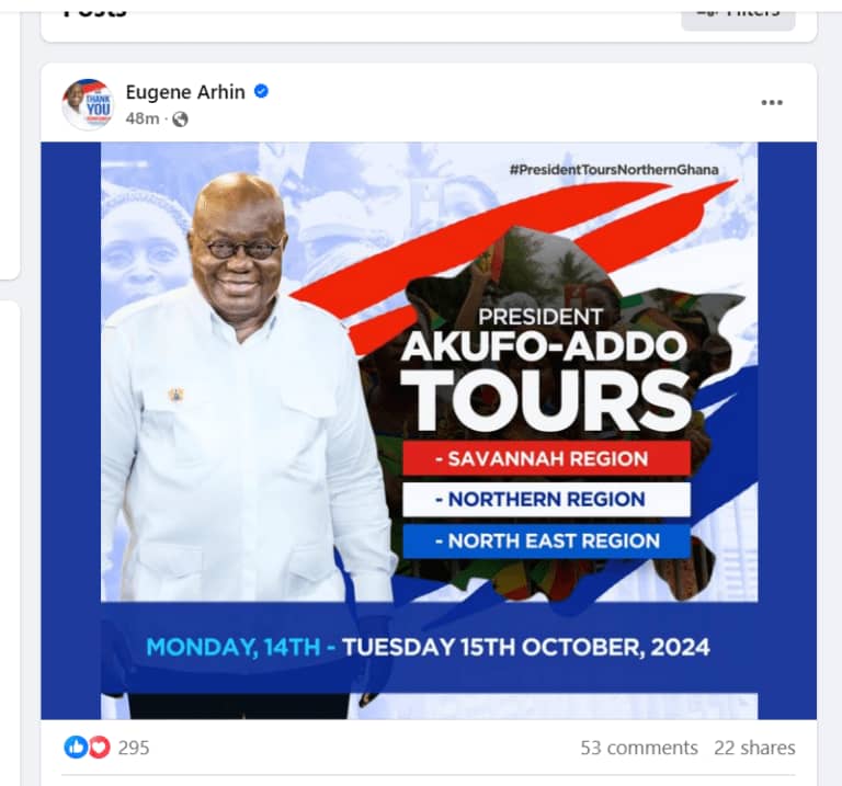 The announcement of the tour was made by Eugene Arhin, the Director of Communications at the Presidency, on his Facebook page today.