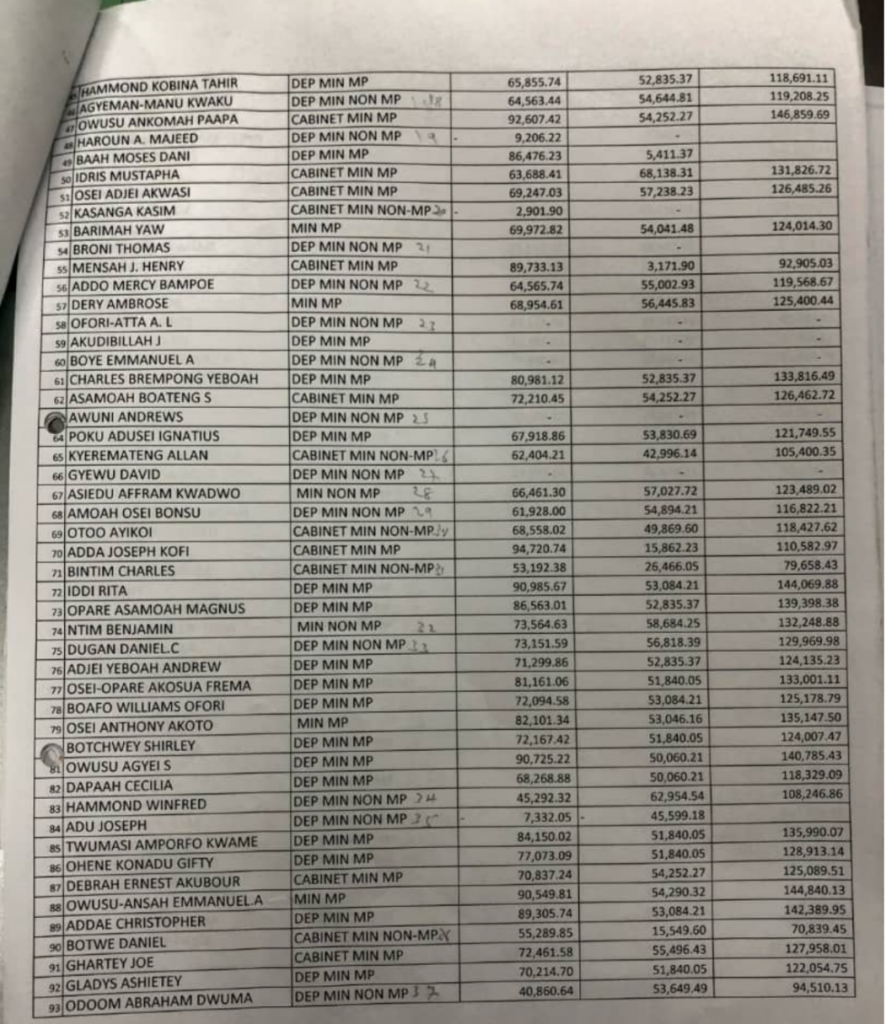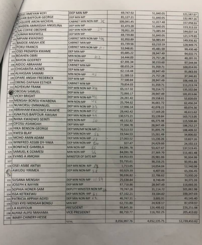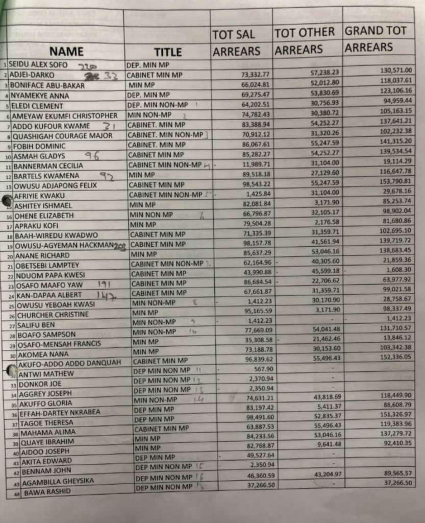 The list of MPs demanding salary arrears includes the current President, Nana Addo Dankwa Akufo-Addo whose grand total arrears is GH¢152, 336.05. Former President J.A. Kufuor is also demanding GH¢226,251.98 as grand total.