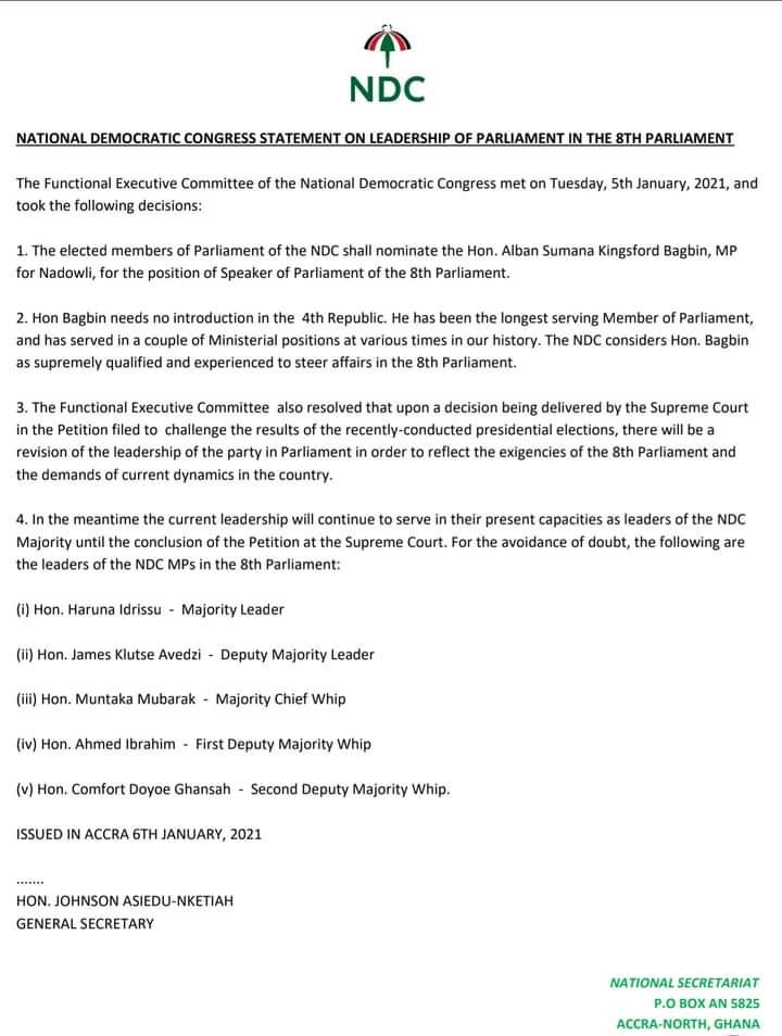 This was announced in a statement issued on Wednesday, January 6, 2021, and signed by the General Secretary of the NDC, Johnson Asiedu Nketia.