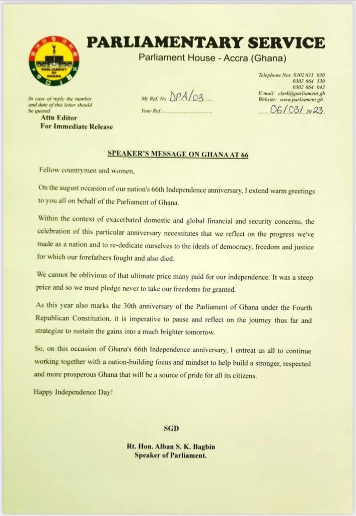 “So on this occasion of Ghana’s 66th Independence anniversary. I entreat us all to continue working together with a nation-building focus and mindset to help build a stronger, respected and more prosperous Ghana that will be a source of pride for all its citizens,” the Speaker urged.