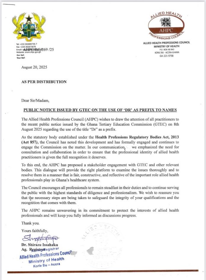 The Allied Health Professions Council (AHPC) has responded to a recent directive by the Ghana Tertiary Education Commission (GTEC) restricting the use of the title “Dr” as a prefix, assuring practitioners that steps are being taken to protect their professional identity.