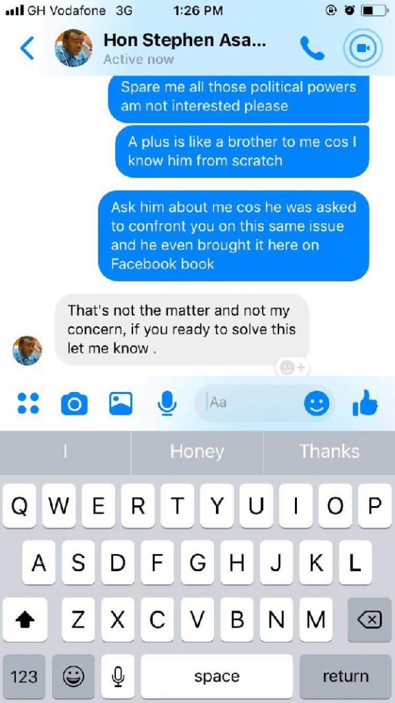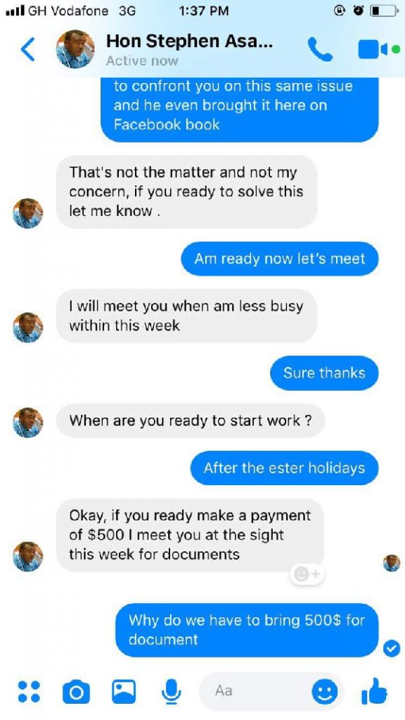 In a Facebook Messenger conversation between the two, Asabee asked Daniel Yeboah to meet up with him and when he is coming, he should be ready with a US$500 payment for supposed documents on the land before he [Daniel Yeboah] starts working on the land again.