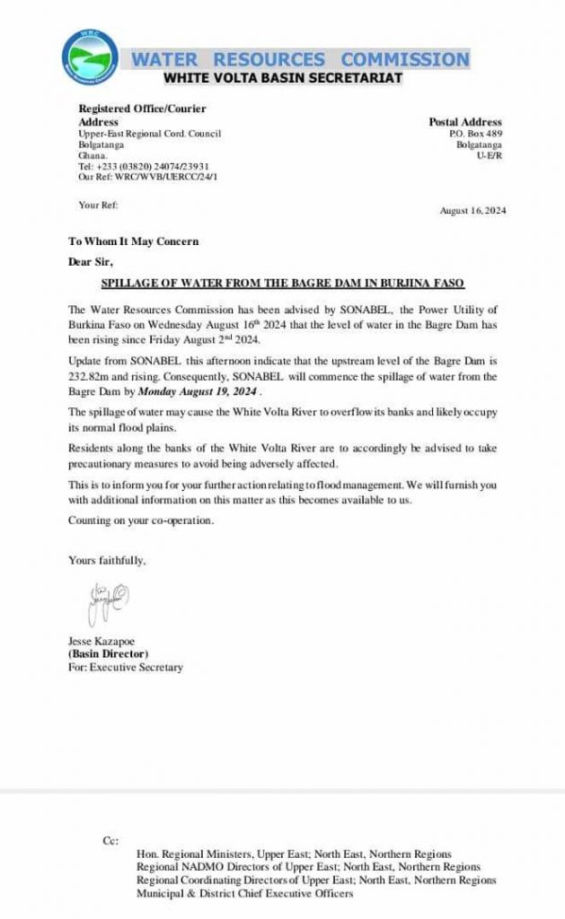 This decision was communicated in a letter from the White Volta Basin Secretariat of the Water Resources Commission to the Regional Ministers and NADMO Directors of the Upper East, North East, and Northern Regions. Issued on August 16, the letter states that the spillage is required due to the rising water levels upstream of the Bagre Dam.