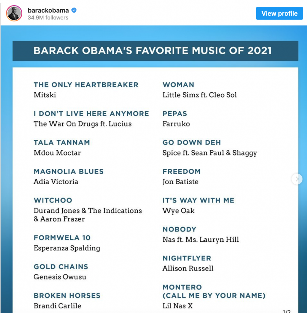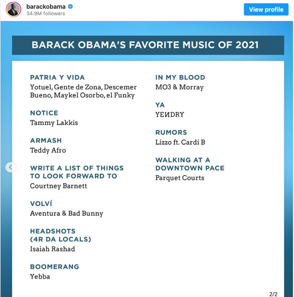 The former president curated a Spotify playlist made up of 27 tracks he enjoyed throughout the year. As with his previous lists, this one included a variety of old and new records that spanned across multiple genres, such as pop, indie rock, reggaeton, and rap.