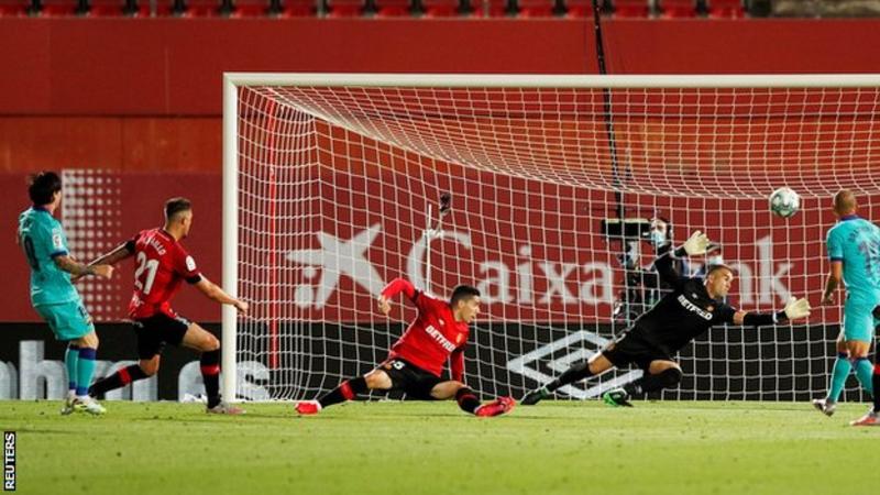 Barcelona scored 66 seconds into their return to action as Lionel Messi completed a comfortable 4-0 win at Mallorca in La Liga.