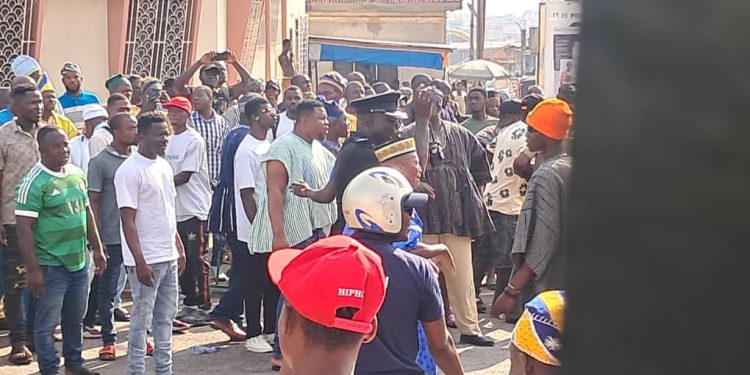 Security personnel struggled to maintain order on Monday, December 1, outside the Manhyia Palace in Kumasi as factions involved in the long-standing Bawku chieftaincy conflict jostled during the mediation processes.