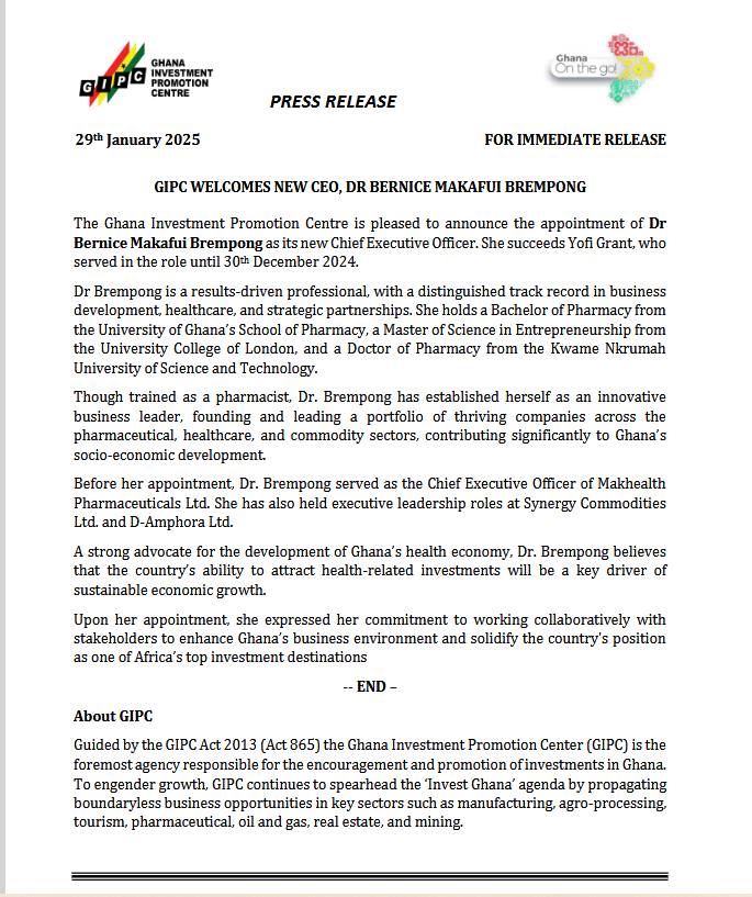 The Ghana Investment Promotion Centre (GIPC) has announced the appointment of Dr. Bernice Makafui Brempong as its new Chief Executive Officer, effective January 29, 2025. She succeeds Yofi Grant, who held the position until December 30, 2024.
