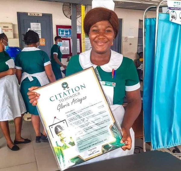 Gloria Atiayao’s story flooded social media after the patient she saved, Bernard Gorni, made a post to the effect, showing pictures of how he, together with the authorities of the hospital, honoured her with a citation.