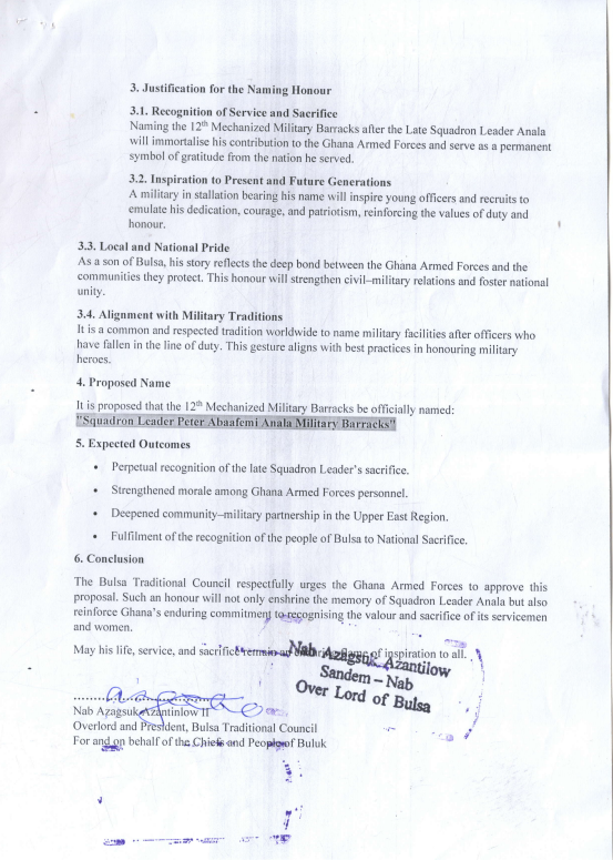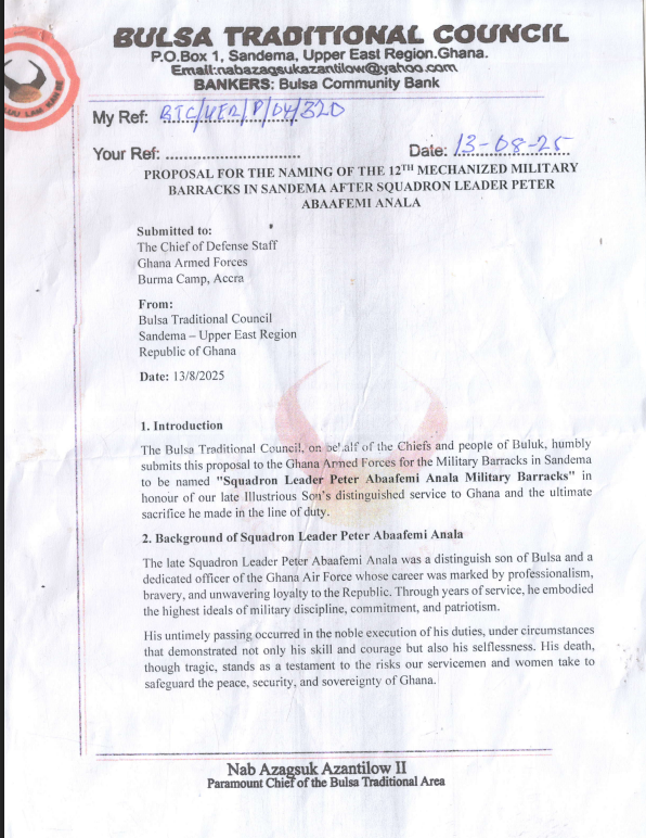 In a proposal dated August 13 and addressed to the Chief of Defence Staff, Vice Admiral Seth Amoama, the Council said the gesture would be a fitting tribute to a distinguished officer whose life was dedicated to service and sacrifice. The document was signed by Nab Azagsuk Azantilow II, Paramount Chief of the Builsa Traditional Area, on behalf of the chiefs and people of Buluk in the Upper East Region.