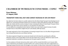 The Chamber of Petroleum Consumers (COPEC) has rejected claims of a looming 20% increase in public transport fares effective Friday, August 8,...