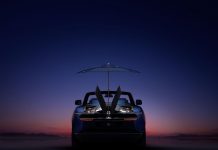 A convertible Rolls-Royce with a back deck that opens up to reveal cocktail tables, fridges for champagne and a parasol matching the...