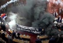 Serbian opposition lawmakers throw smoke grenades and tear gas in parliament