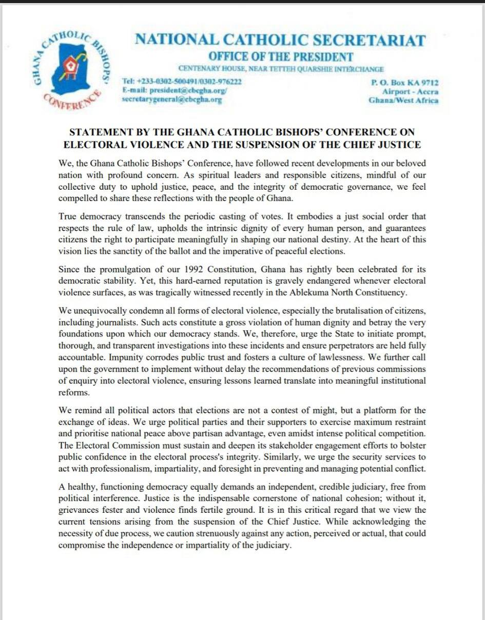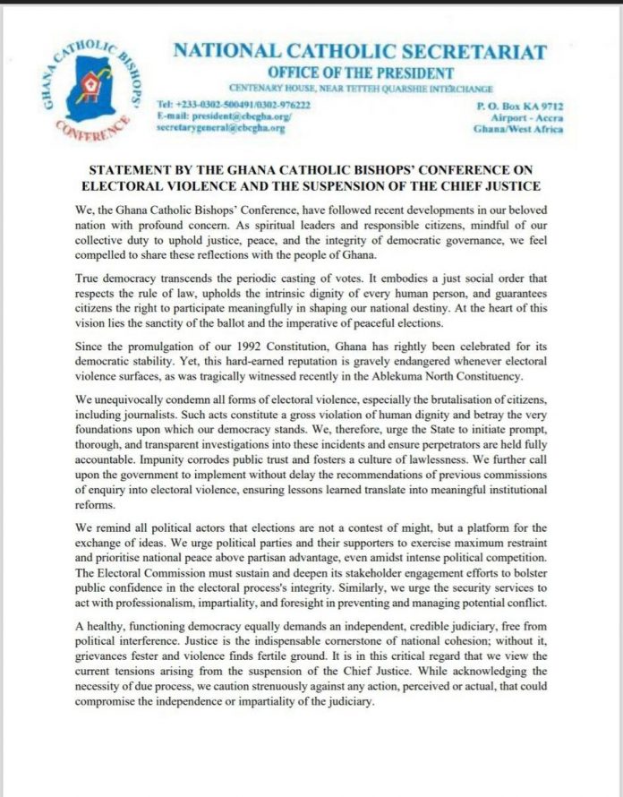 The Ghana Catholic Bishops’ Conference has expressed deep concern over the recent suspension of the Chief Justice, warning that the move risks compromising the independence and impartiality of the judiciary at a time of heightened political tension.