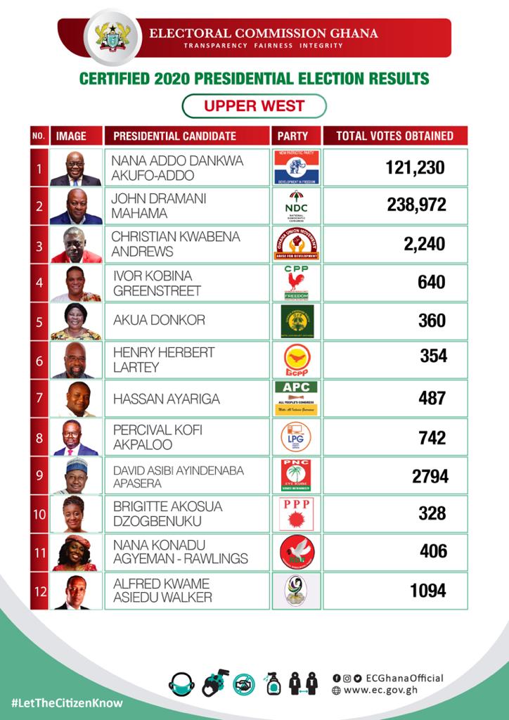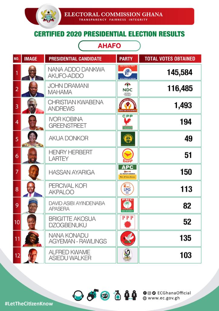 The certified results are from the Bono, Ahafo, Volta, North East, Upper West, Central and Oti regions.