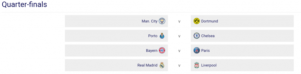 Only two of the remaining teams are top of the table in their domestic leagues; with La Liga leaders Atletico Madrid having been knocked out in the round of 16.