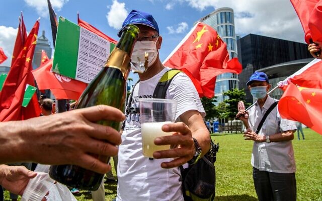 Pro-China supporters display Chinese and Hong Kong flags as they pour champagne during a rally near the government headquarters in Hong Kong on June 30, 2020, as China passed a sweeping national security law for the city.