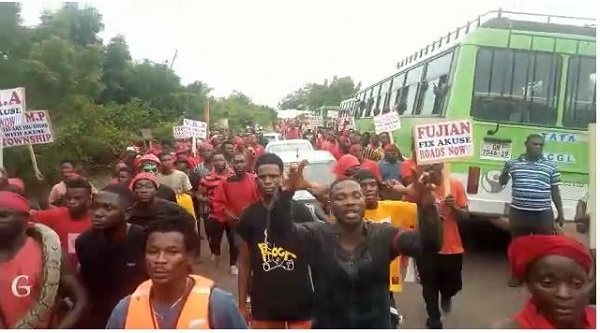 Scores of commercial drivers and the people of Osudoku in the Shai Osudoku district this morning, Monday, 26 September 2022, are demonstrating their displeasure over the deplorable road network state from Akuse Junction to Akuse township, Asutsuary to Osuwem and Volivo.