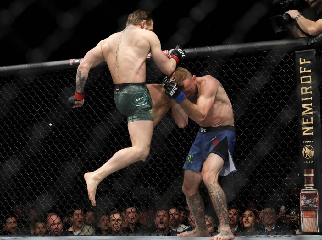 McGregor then stepped back and a head kick high over the guard landed square on the jaw of Cerrone, who fell to the floor and was left covering up as the Irishman rained down punches, prompting an early stoppage.