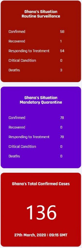 “As at the morning of 27 March 2020, a total of fifty-seven (57) cases including three (3) deaths have been confirmed from the regular surveillance systems. All the three (3) cases that unfortunately succumbed to the disease were aged and had underlying chronic medical conditions. All the other fifty-four (54) cases are well; fourteen (14) are being managed at home and the rest are responding well to treatment on admission in isolation. They are awaiting their test results and will be discharged when the results are negative,” the Ghana Health Service announced on its page Friday morning.