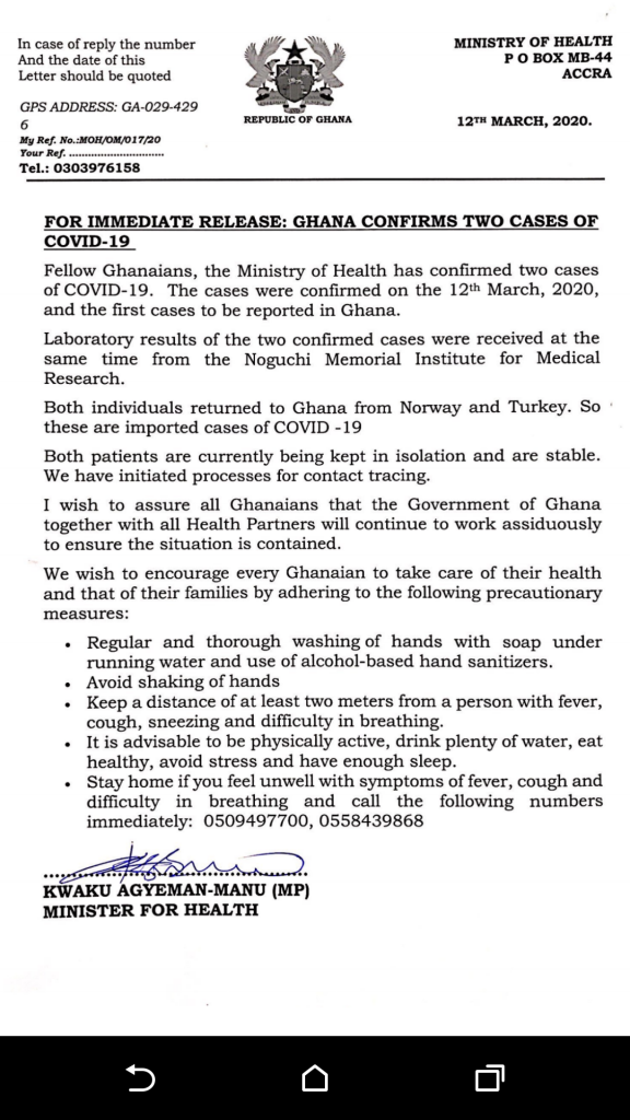 “Both individuals returned to Ghana from Norway and Turkey. So these are imported cases of COVID-19.”
