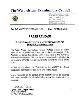 In a statement signed by the Head of Public Affairs WAEC, Agnes Teye-Cudjoe, the move is in line with the protocols put in place by governments of WAEC member countries to prevent the spread of the virus.