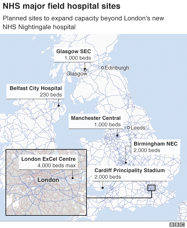 In Wales, more than 6,000 extra beds are being set up in temporary hospitals – many in sports and leisure facilities, including Cardiff’s Principality Stadium.