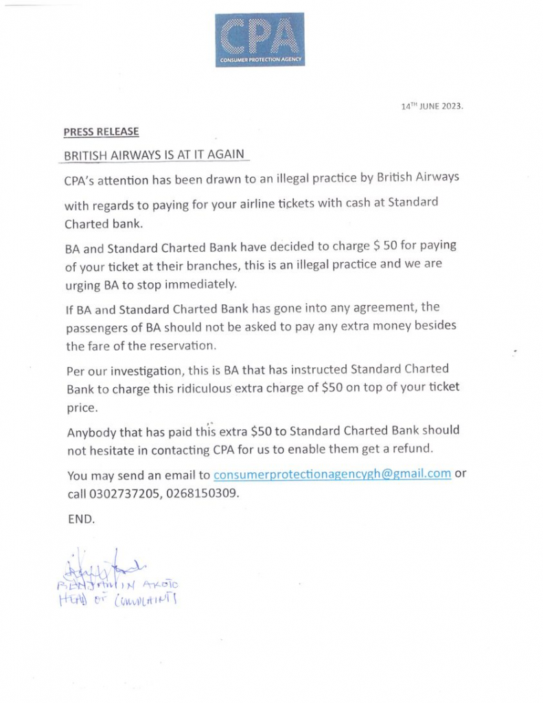 “CPA’s attention has been drawn to an illegal practice by British Airways with regards to paying for your airline tickets with cash at Standard Charted Bank.