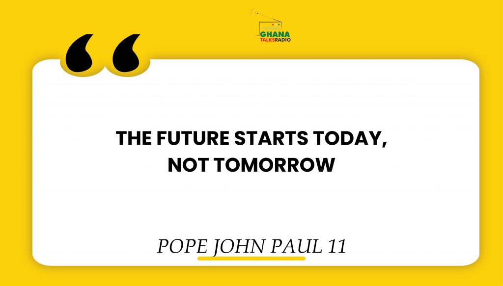 LifestyleInspirational Quotes Daily Inspirational Quote | GhanaTalksRadio.com | April 06 | 2023 6th April 2023 0 259 Share Facebook Twitter WhatsApp Linkedin Pinterest Telegram Viber THE FUTURE STARTS TODAY, NOT TOMORROW.