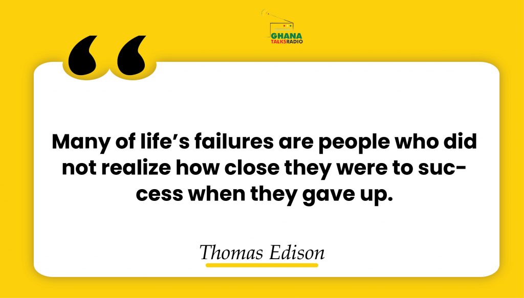 LifestyleInspirational Quotes Daily Inspirational Quote | GhanaTalksRadio.com | Dec 05 | 2022 5th December 2022 0 310 Share Facebook Twitter WhatsApp Linkedin Pinterest Telegram Viber “Many of life’s failures are people who did not realize how close they were to success when they gave up.”