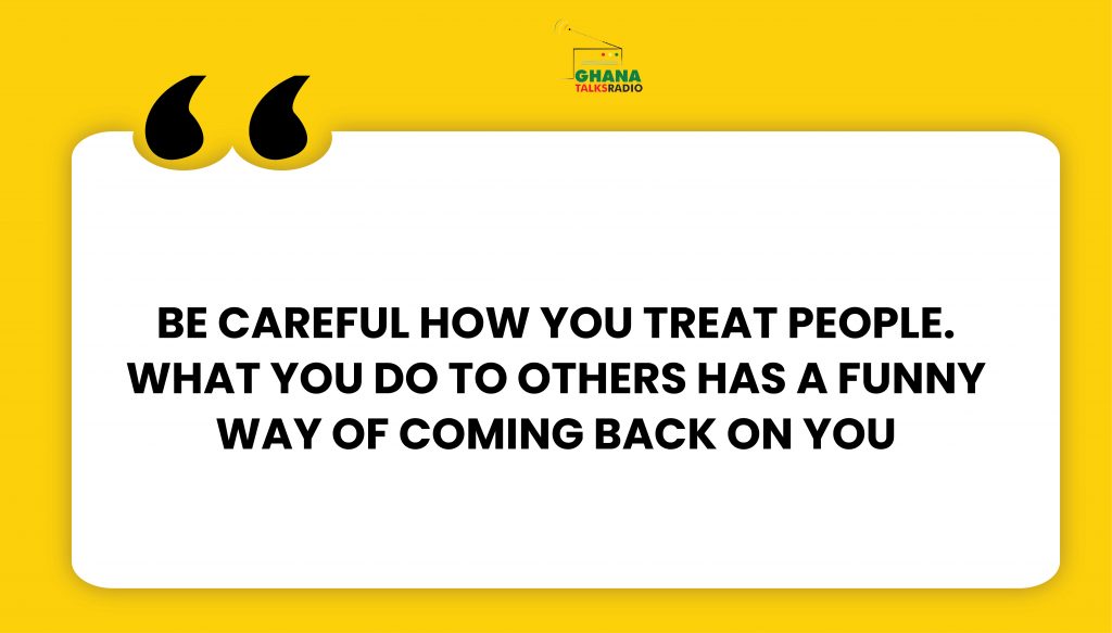 LifestyleInspirational QuotesNewsNational Daily Inspirational Quote | GhanaTalksRadio.com | Feb 03 | 2023 3rd February 2023 0 310 Share Facebook Twitter WhatsApp Linkedin Pinterest Telegram Viber BE CAREFUL HOW YOU TREAT PEOPLE. WHAT YOU DO TO OTHERS HAS A FUNNY WAY OF COMING BACK ON YOU.
