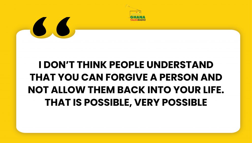 LifestyleInspirational Quotes Daily Inspirational Quote | GhanaTalksRadio.com | Feb 22 | 2023 22nd February 2023 0 379 Share Facebook Twitter WhatsApp Linkedin Pinterest Telegram Viber I DON’T THINK PEOPLE UNDERSTAND THAT YOU CAN FORGIVE A PERSON AND NOT ALLOW THEM BACK INTO YOUR LIFE. THAT IS POSSIBLE, VERY POSSIBLE.
