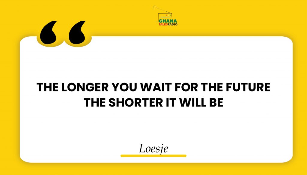 LifestyleInspirational QuotesNewsNational Daily Inspirational Quote | GhanaTalksRadio.com | Feb 27 | 2023 27th February 2023 0 309 Share Facebook Twitter WhatsApp Linkedin Pinterest Telegram Viber “THE LONGER YOU WAIT FOR THE FUTURE THE SHORTER IT WILL BE.” ~Loesje