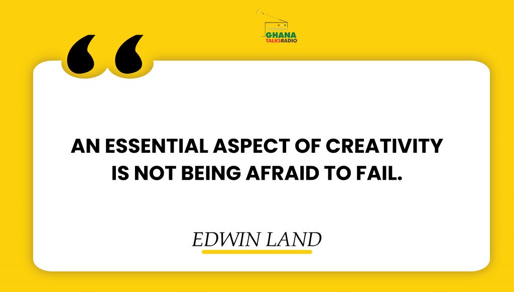 LifestyleInspirational Quotes Daily Inspirational Quote | GhanaTalksRadio.com | Jun 25 | 2023 25th June 2023 0 231 Share Facebook Twitter WhatsApp Linkedin Pinterest Telegram Viber “AN ESSENTIAL ASPECT OF CREATIVITY IS NOT BEING AFRAID TO FAIL.” ~Edwin Land